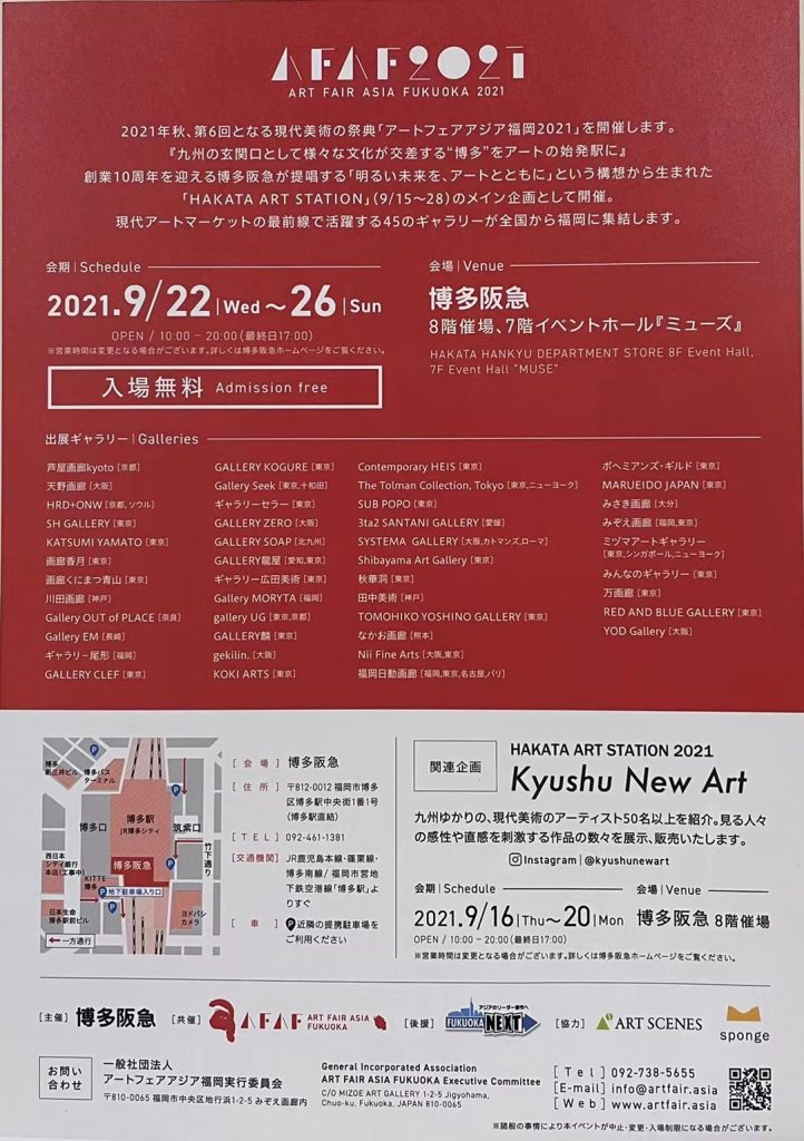 現代美術の祭典 アートフェアアジア福岡2021by enenに 展覧会情報on 投稿日: 2021年9月22日2025年8月13日 2021.09.22 ~ 2021.09.26 博多阪急 8階催場、7階イベントホール「ミューズ」